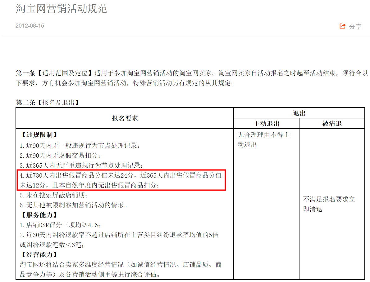 营销活动需要近730天(即2年)内出售假冒商品分值未达到24分,近365天未达到12分,且本自然年度无出售假冒商品扣分,才有机会参加淘宝网营销活动,特殊营销活动另有规定的从其约定