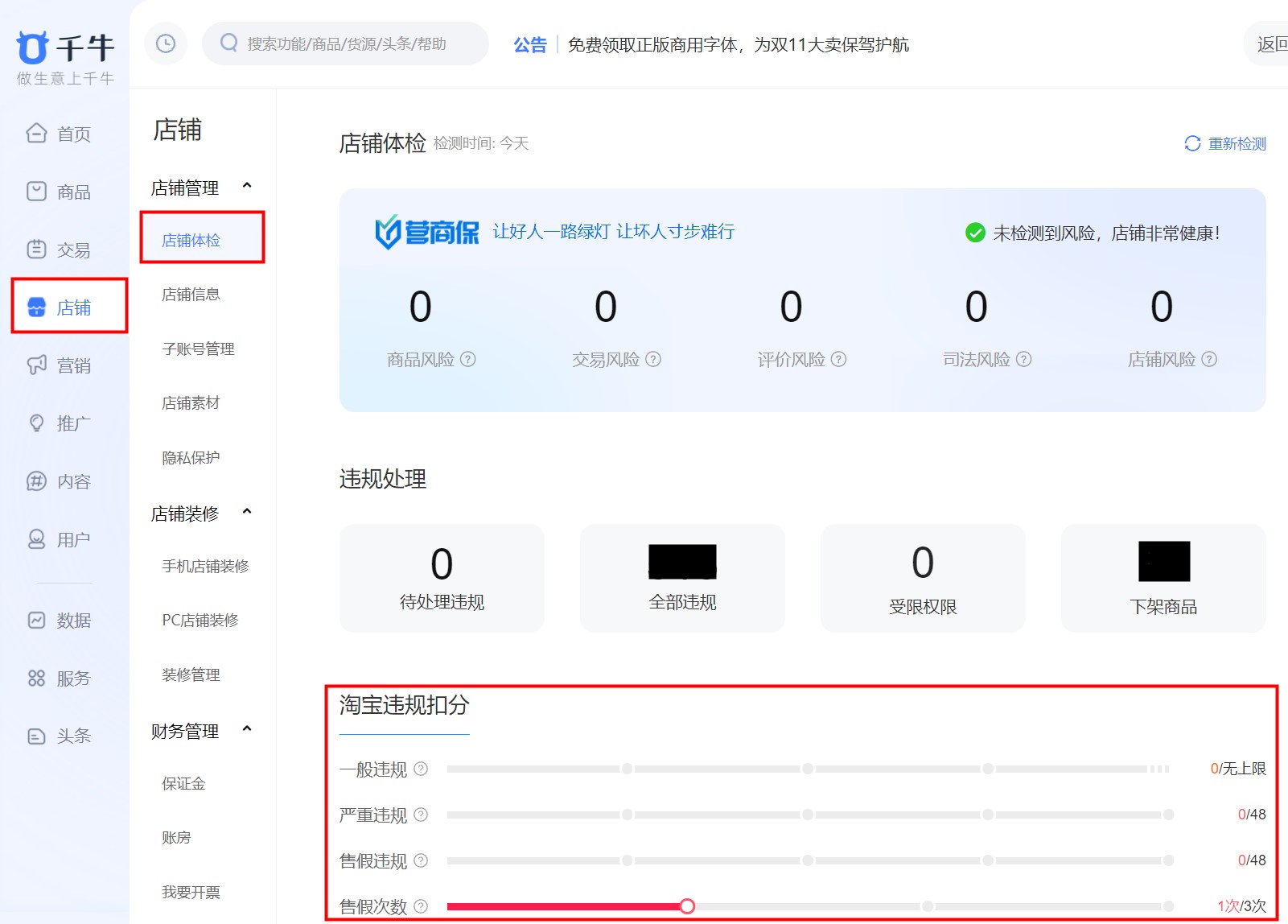 商家朋友们可以通过【千牛卖家中心】-【店铺】-【店铺体检】-【淘宝违规扣分】的售假违规计售假次数查看