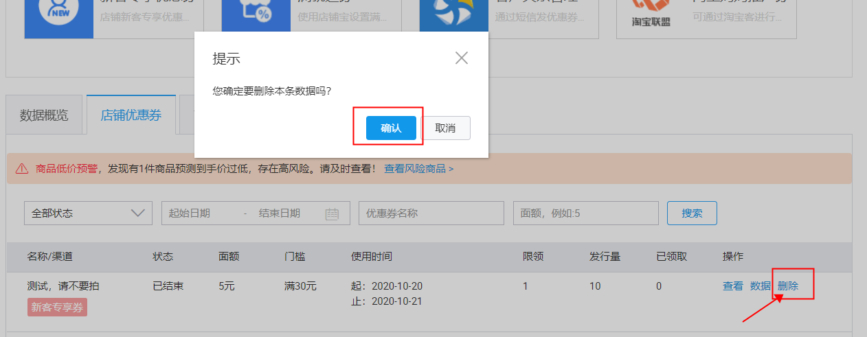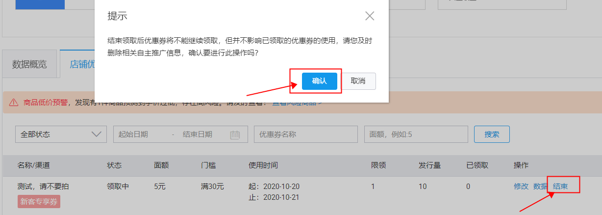 新客专享券商家可自行在后台操作删除,具体操作步骤:点击“结束”按钮,按照提示操作后,即可删除该券,如下步骤: