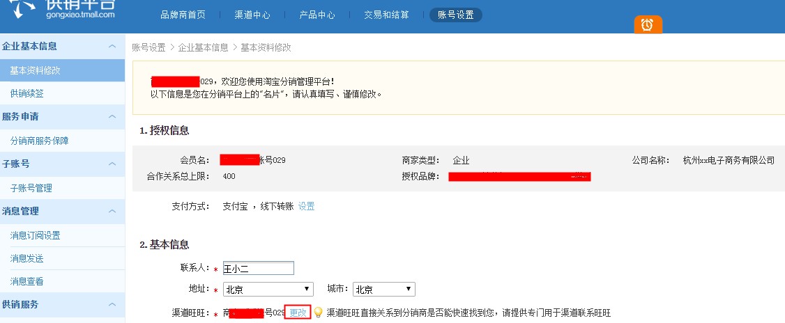 亲,请您进入供销平台后台,在【账号设置 】-【企业基本信息】-【基本资料修改】,点击"渠道旺旺",进行修改即可。