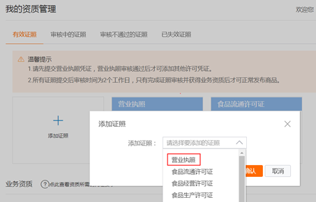 1、点击‘添加证照’然后点选“营业执照”并确认