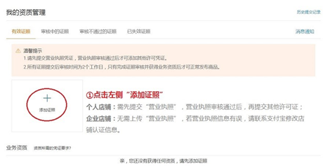 【第一步】:个人店铺添加营业执照(企业店铺无需提交营业执照)