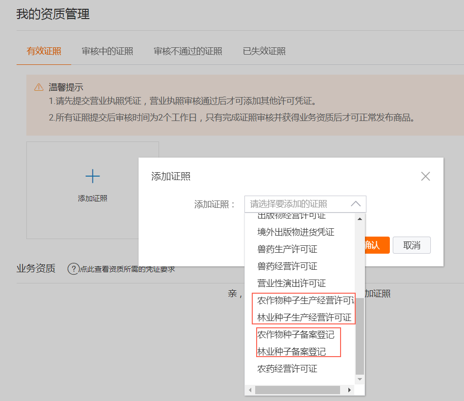 若您是个人店铺:先【上传营业执照】,待2个工作日审核通过后,在【上传行业许可证】,待2个工作日审核通过后,就可获得种子的业务资质