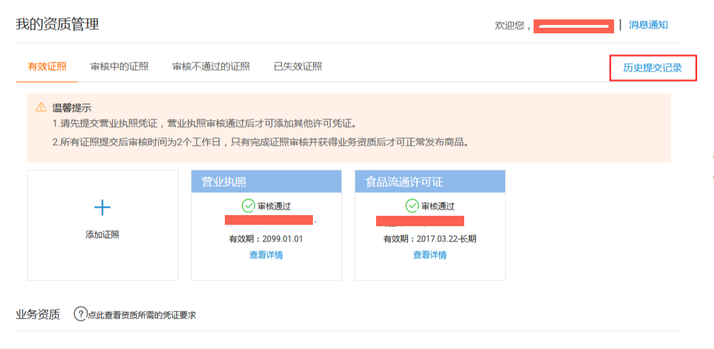 请您进入资质备案页面(https://scportal.taobao.com/quali/portal.htm?spm=0.0.0.0.dtEUIv),点击右上角的历史提交记录,即可查看所有证件的审核结果。若想要知道为什么审核不通过,请点击“审核不通过的证照”。示例: