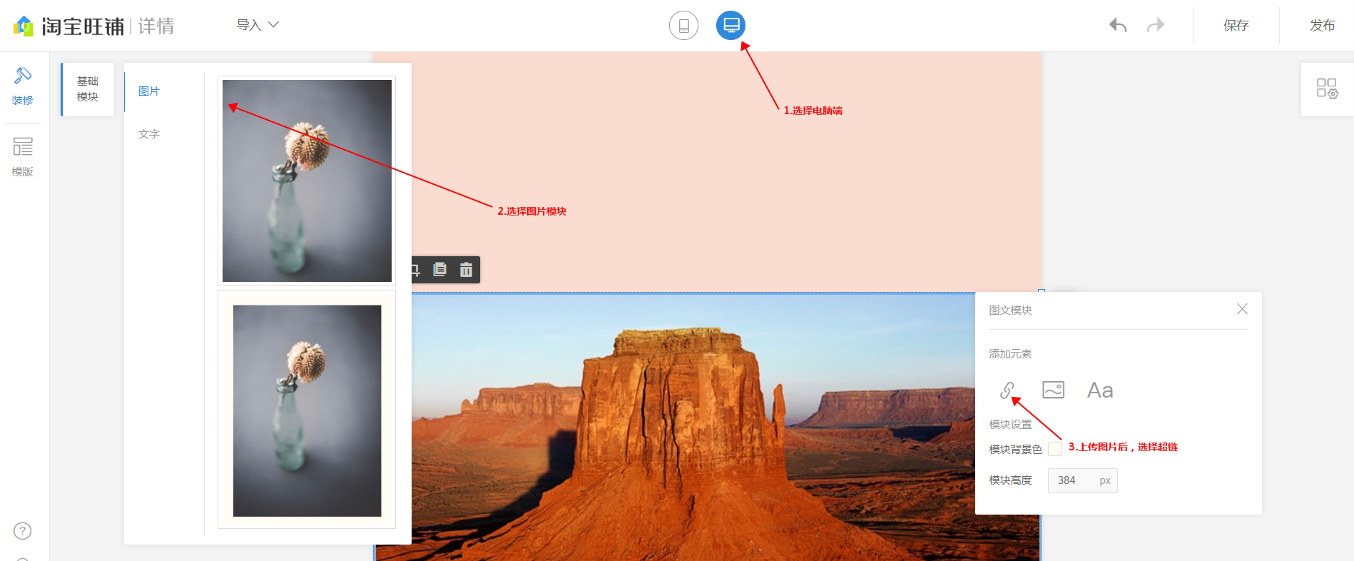 请进入【卖家中心】-【店铺装修】-【详情装修】找到要装修的宝贝点击“装修详情”,点击“电脑”,点击左侧“基础模块”-“图片”,插入图片空间图片后,点击超链