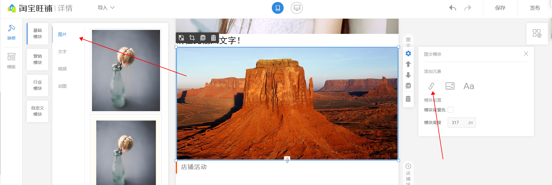 请进入【卖家中心】-【店铺装修】-【详情装修】找到要装修的宝贝点击“装修详情”,点击左侧“基础模块”-“图片”,插入图片空间图片后,点击超链