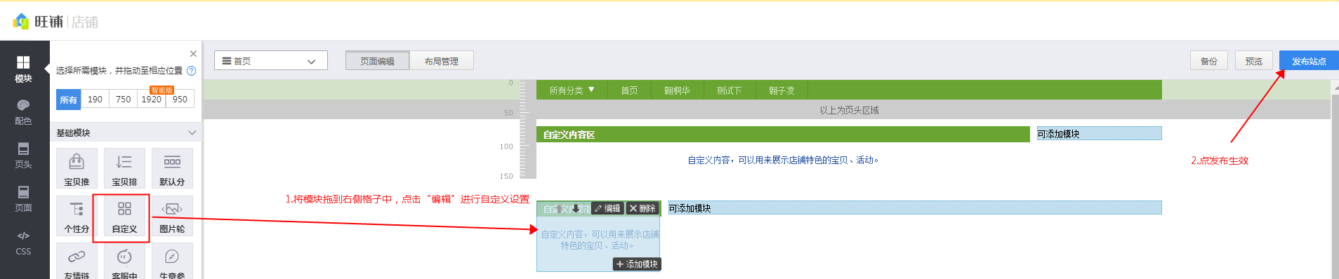 亲,店铺装修自定义区/自定义模块设置方式如下: