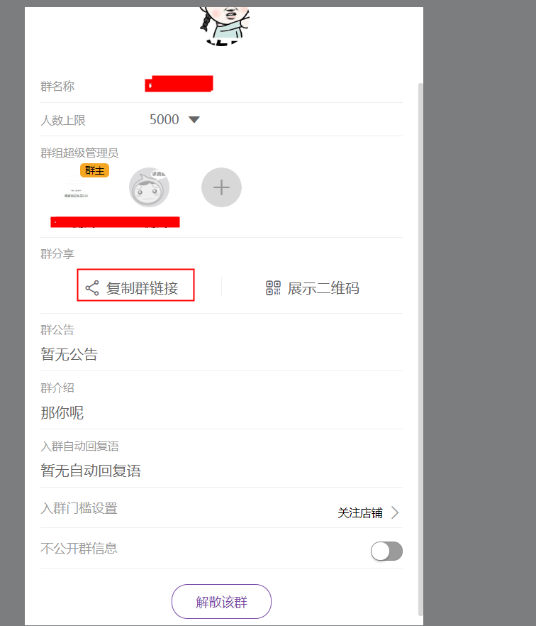 进入页面,选择一个群,找到对应群后,点击右上角进入群组信息设置页面