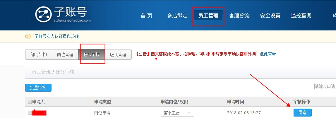 亲,该审核是由您店铺主账号进行审核操作的,建议可让主账号通过【子账号管理】-【员工管理】-【任务审核】找到子账号申请人提交记录,审核操作同意即可。