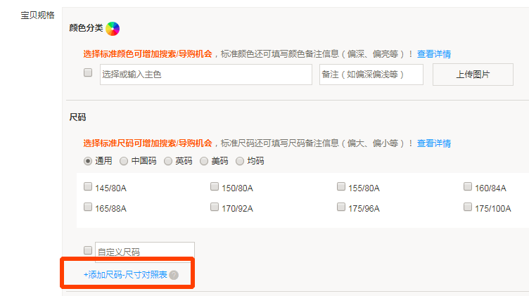 注意:并非每个类目都有尺码助手、“宝贝规格”模块与尺码-尺寸对照表设置入口,请您以当下类目的发布页、详情页显示为准。