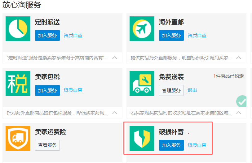 1) 符合条件的卖家可进入【卖家中心】-【淘宝服务】-【加入服务】进行操作