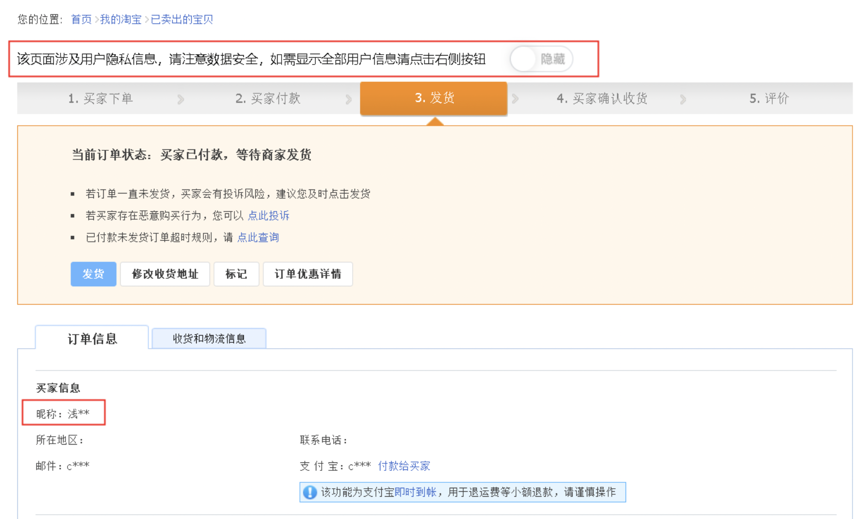 1.买家昵称:第一个字符显示,其余模糊,只保留两位**(如:买家测试,隐藏后:买**)