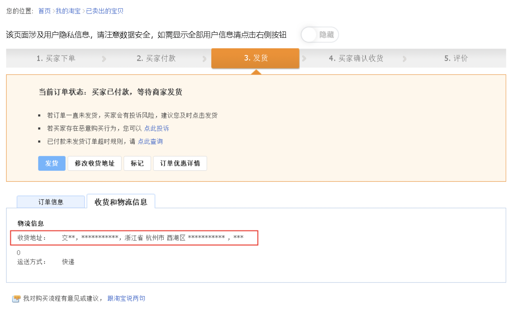 2.订单收货人姓名:不看字数,第一个字符显示,其余模糊,首字+**(如:买家测试购买账号,隐藏后:买**)
