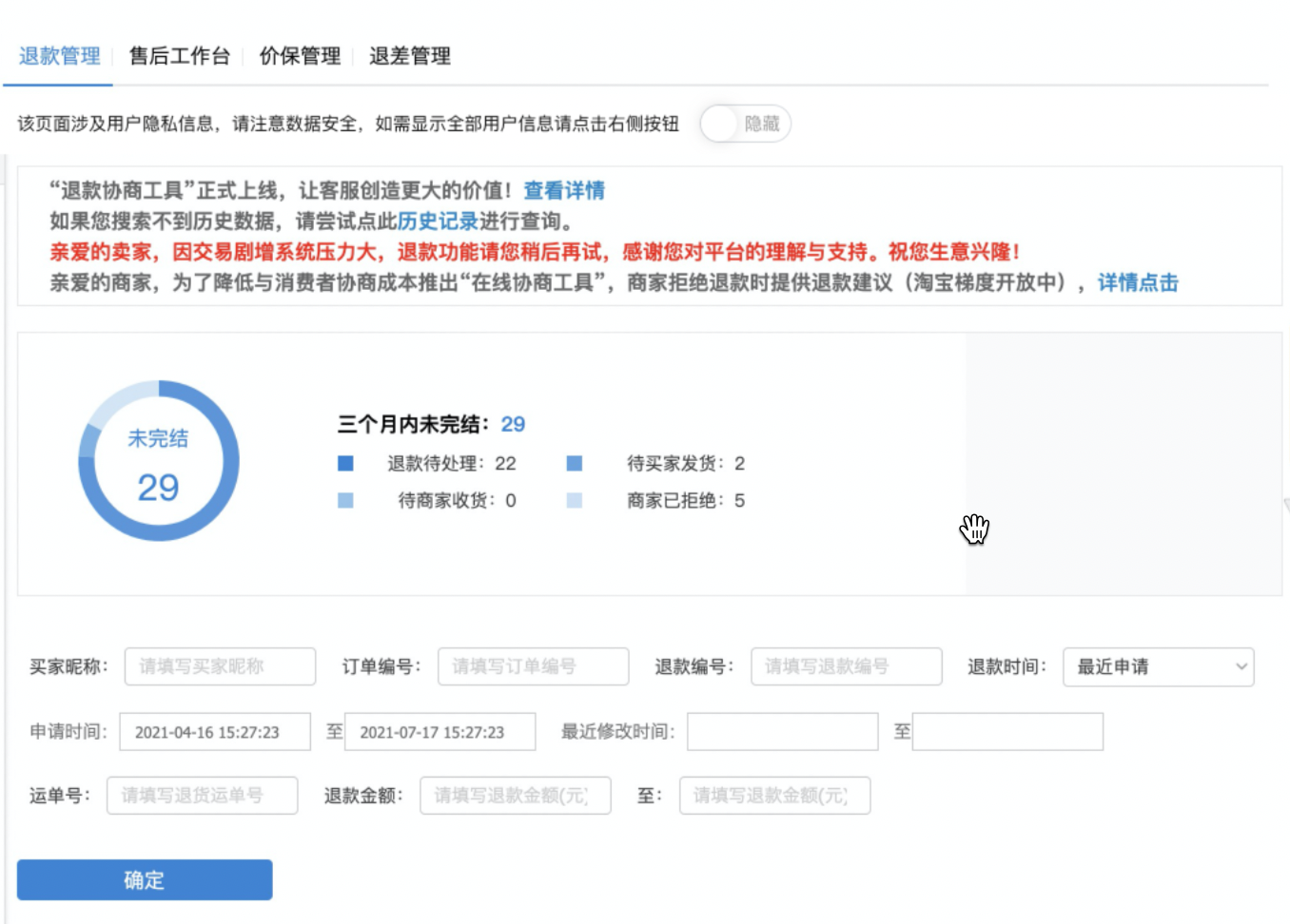 根据国家相关法律法规及平台数据安全规范的要求,平台将对卖家中心及退款管理相关页面的消费者敏感信息(如:收件人姓名、手机号)进行【默认】隐藏处理。