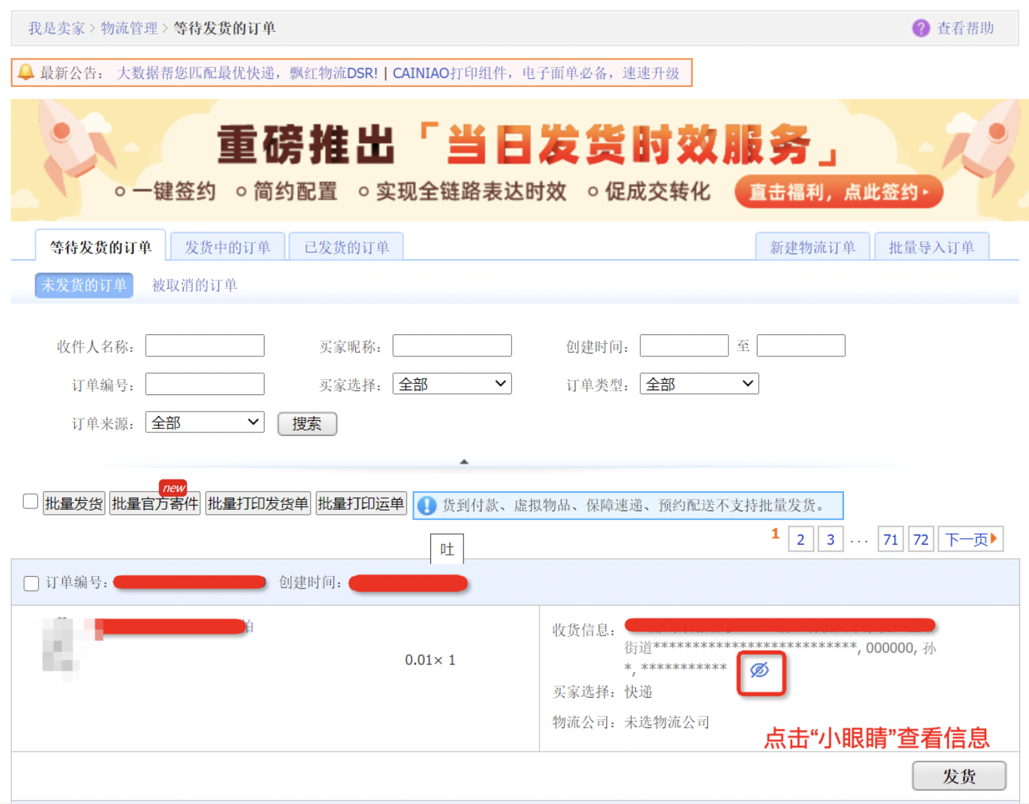 3.发货页面,只需点击对应页面的取消“隐藏”按钮或相关页面的“小眼睛”,即可查询相关信息。