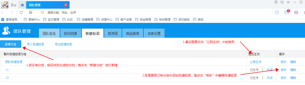 1.电脑端千牛:请打开任意聊天窗口,点击:快捷短语,再选择个人或者团队快捷短语设置界面(若店铺没有子账号,无"团队"的选项),若子账号要设置团队快捷短语,需授权千牛团队管理权限才可操作【请点此查看授权方式】 ;团队快捷短语的设置,请点击“管理团队快捷短语”,可新建分组,将分组中再新建快捷短语(例如分组:售前,在该分组中设置关于售前客服常用的快捷短语),新建分组后,再点击“修改”,进去新建该分组中的快捷短语,设置完毕后保存,再回到分组界面点击立即生效。
