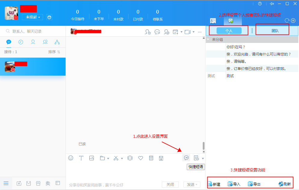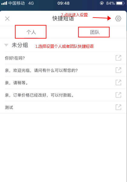 4.若店铺未创建子账号,快捷短语设置页面没有“团队” 的选项