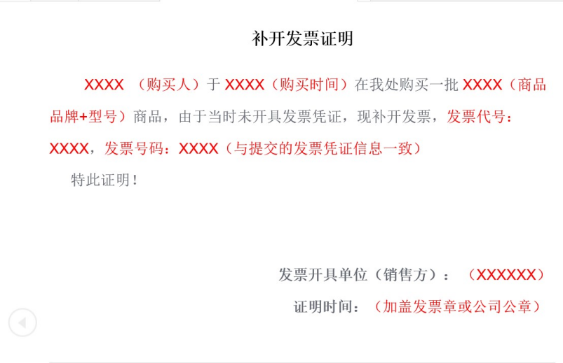 6、发票补开证明:证明中的购买人、商品型号、采购时间、采购数量和采购时间需与发票一致,且证明中需完整描述发票代号与发票号码并加盖公章或发票章