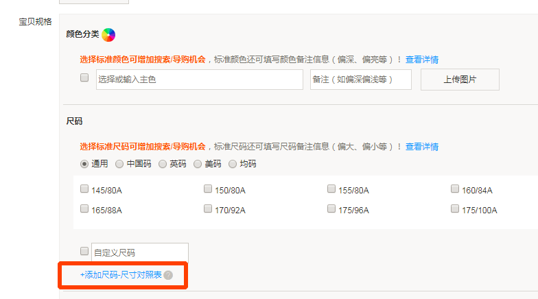 注意:并非每个类目都有“宝贝规格”模块与尺码-尺寸对照表设置入口,请您以当下类目的发布页显示为准。