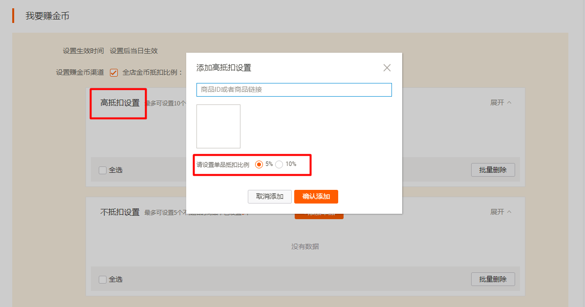 当您的“全店金币抵扣比例”选择5%时,高抵扣设置只能选10%;