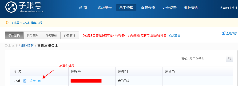 亲,被删除的子账号是可以恢复的。但权限,岗位,密码,验证手机将重新设置。恢复方式:请主账号进入【卖家中心】-【子账号管理】-【员工管理】点击“查看离职员工”,再找到删除的子账号点击“任用”后重新填写资料后使用
